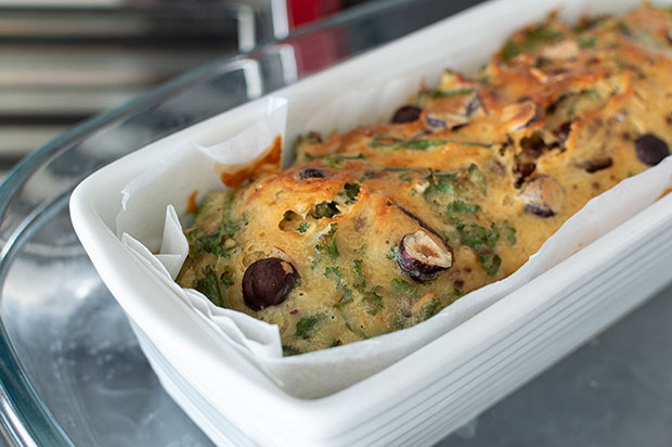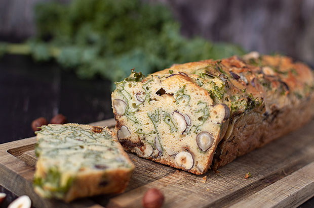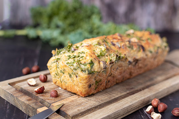 La recette du Cake salé au chou kale, tomates et noisettes