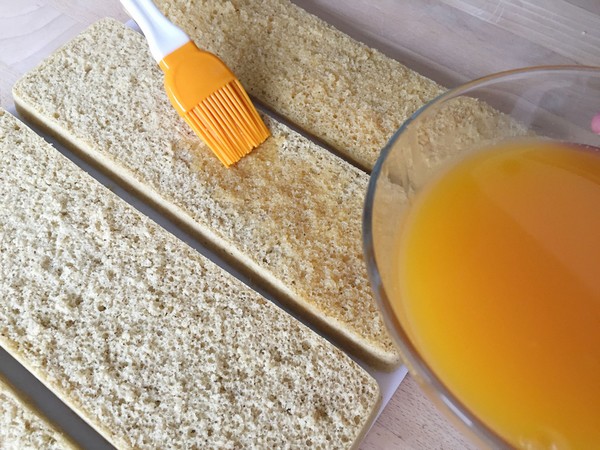 - Pour le montage de la bûche : Lorsque le biscuit est froid, découpez-le en 4 tranches égales.