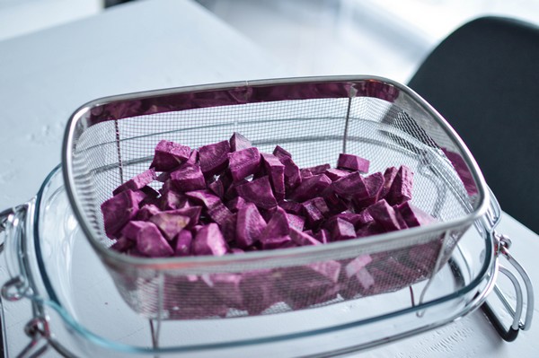 Grâce à la cuisson à L’Omnicuiseur Vitalité, vous gardez la belle couleur pourpre étonnante des patates douces, mais aussi toutes les vitamines comme la vitamine A, minéraux, anti-oxydants etc…. seront préservés. On utilise souvent la patate douce violette dans des desserts car elle est plus sucrée, plus fruitée et moins farineuse que la patate douce classique qui est de couleur orange. Vous pouvez bien sûr utiliser l’orange vous aurez une autre couleur tout aussi jolie.