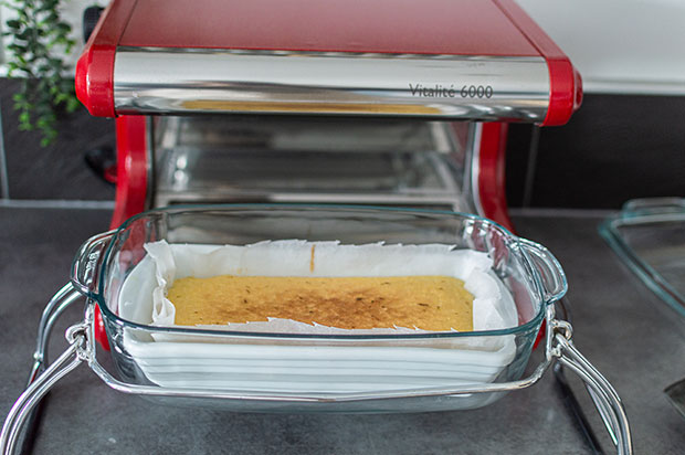 • Transvasez la pâte dans le moule rectangulaire recouvert de papier cuisson et procédez à la cuisson.