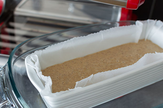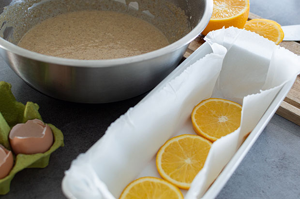 - Tapissez le moule à cake de papier cuisson et tapissez l’intérieur avec les tranches d’oranges.
