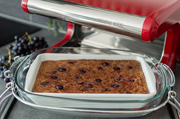 Ce clafoutis est préparé avec des ingrédients naturels et sains tels que du raisin bio, des œufs bio, du sucre non raffiné et du lait végétal. Cela en fait un dessert nutritif et équilibré grâce à la cuisson à l’Omnicuiseur.