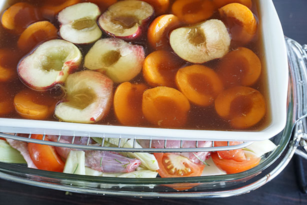 - Répartissez les fruits dans le plat, le niveau du sirop devrait arriver à hauteur des fruits
