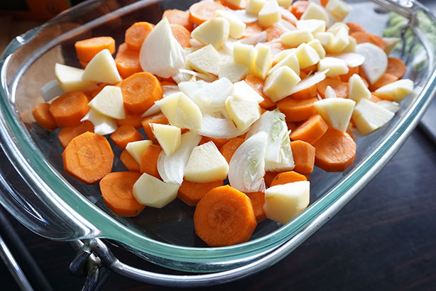 - Épluchez les carottes, la pomme et l’oignon. Coupez les en petits morceaux