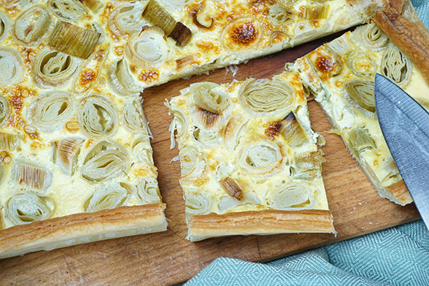 - Foncez le plat à gratin avec la pâte et déposez les poireaux dessus