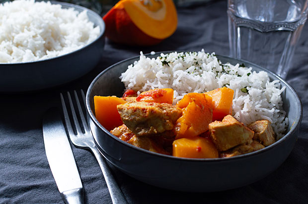 La recette du Curry de poulet au potimarron, épices et riz basmati