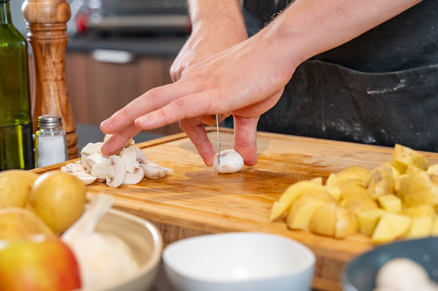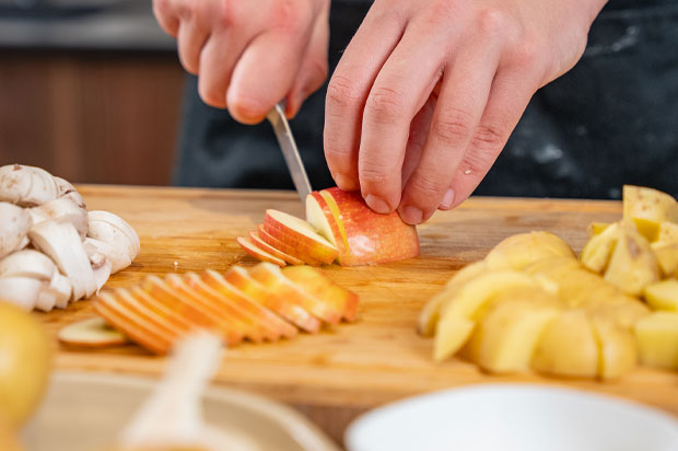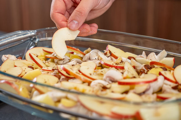 - Taillez les champignons en lamelles, les Pink Lady en quartier et les pommes de terre en 6.