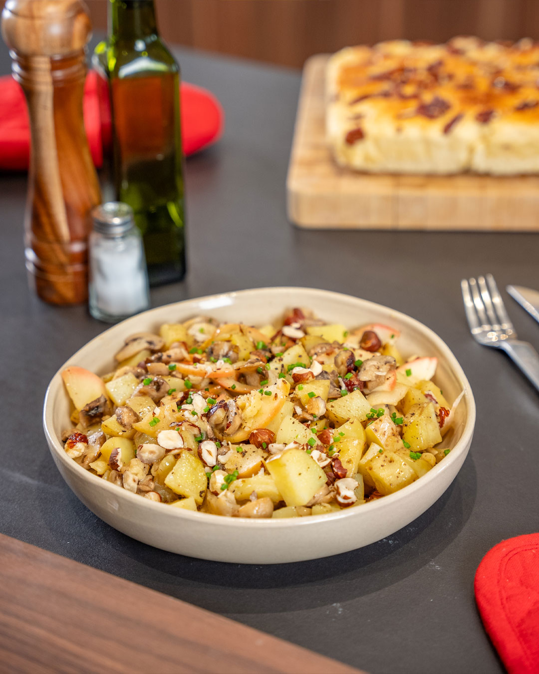 La recette de « Poêlée » aux pommes et aux champignons de Paris & Brioche dorée au sirop d’érable et noix de pécan