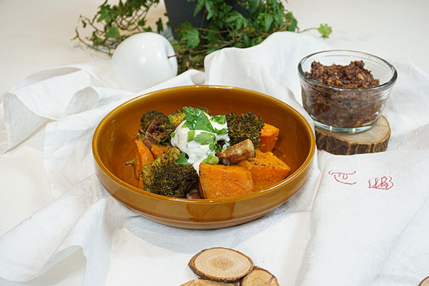 La recette des Légumes rôtis aux épices cajun & compote de banane au chocolat