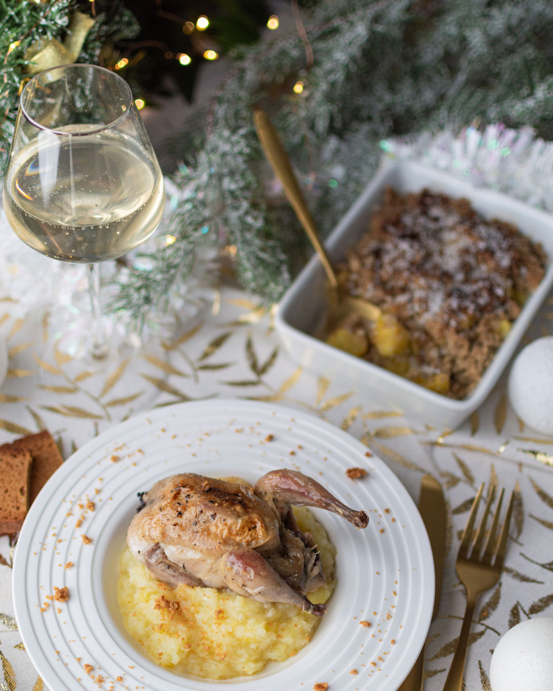 La recette facile Cailles farcies, purée de céleri au pain d’épice et crumble ananas