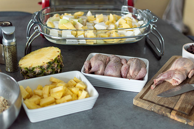 - Déposez-la sur les morceaux d’ananas, puis placez le plat sur la grille, ainsi que celui avec les cailles.