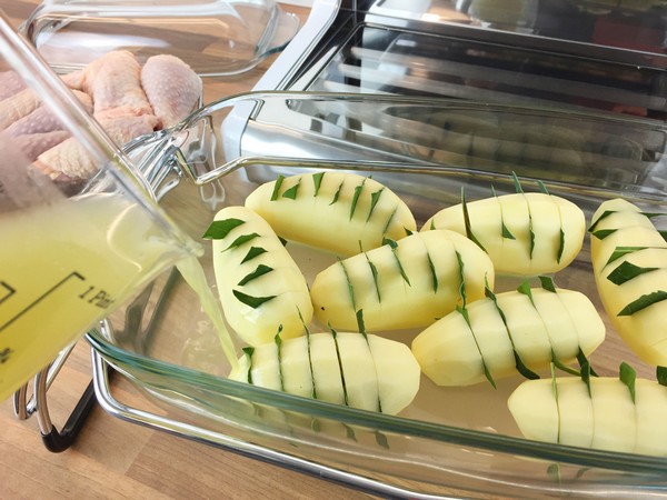 - Huilez le fond de la cocotte. Rangez les pommes de terre serrées les unes contre les autres. Glissez une lanière de laurier entre chaque tranche de pomme de terre.
