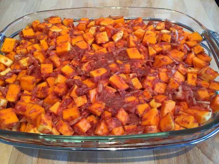 - Épluchez et coupez la courge en cubes (2 cm maximum). Dans un récipient, mélangez le coulis de tomates, les oignons émincés finement, l’ail, les herbes de Provence, le sel / poivre et ajoutez pour finir la courge.
