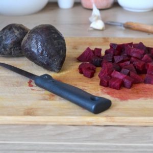 - Épluchez les pommes de terre et les betteraves, et coupez-les en dés. Épluchez les carottes et tranchez-les finement. Détaillez le tofu en dés.