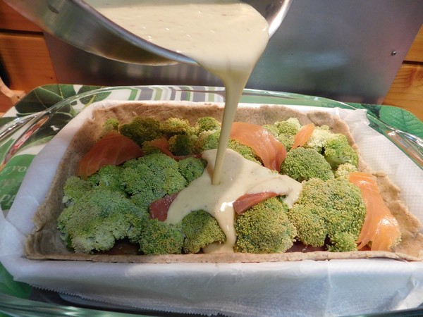 - Coupez les bouquets du brocoli et déposez-les sur la pâte avec le saumon. Mélangez au fouet le restant des ingrédients dans un saladier sauf le gruyère.