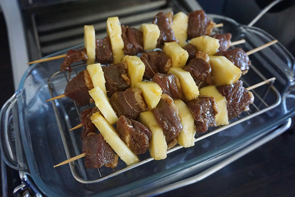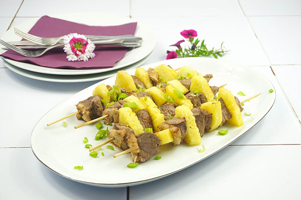 Vous pouvez utiliser de l’ananas en boîte mais le goît sera plus sucré. Vous pouvez remplacer l’ananas pardes abricots. Ces brochettes sont excellentes avec un riz blanc.